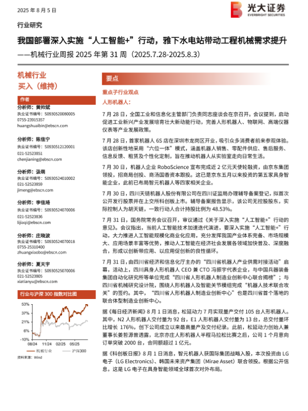 【光大证券】【20250805】机械行业周报2025年第31周:我国部署深入实施“人工智能+”行动,雅下水电站带动工程机械需求提升-14页 行业研究