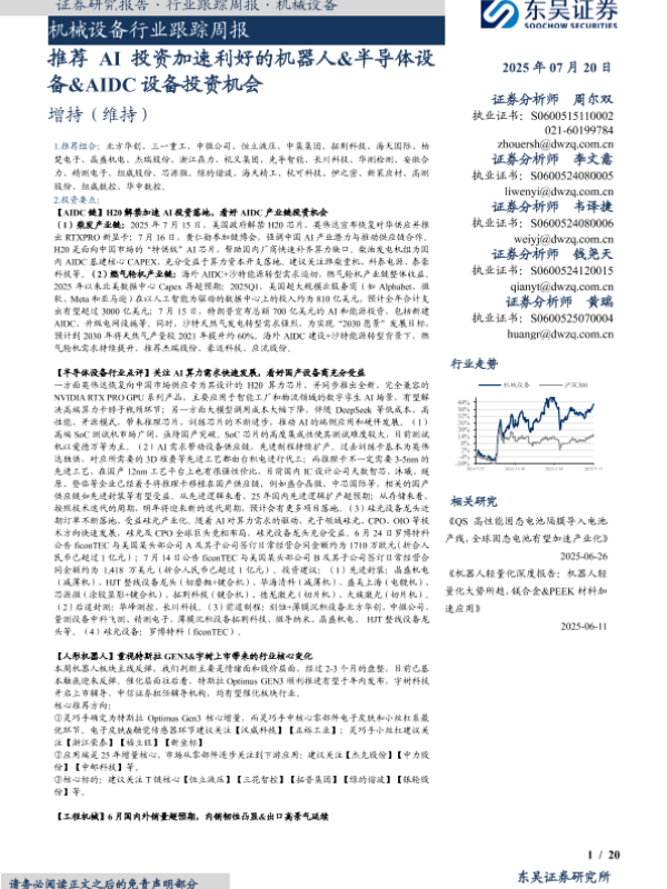 【东吴证券】【20250720】机械设备行业跟踪周报:推荐AI投资加速利好的机器人&半导体设备&AIDC设备投资机会-20页 证券期货研究报告
