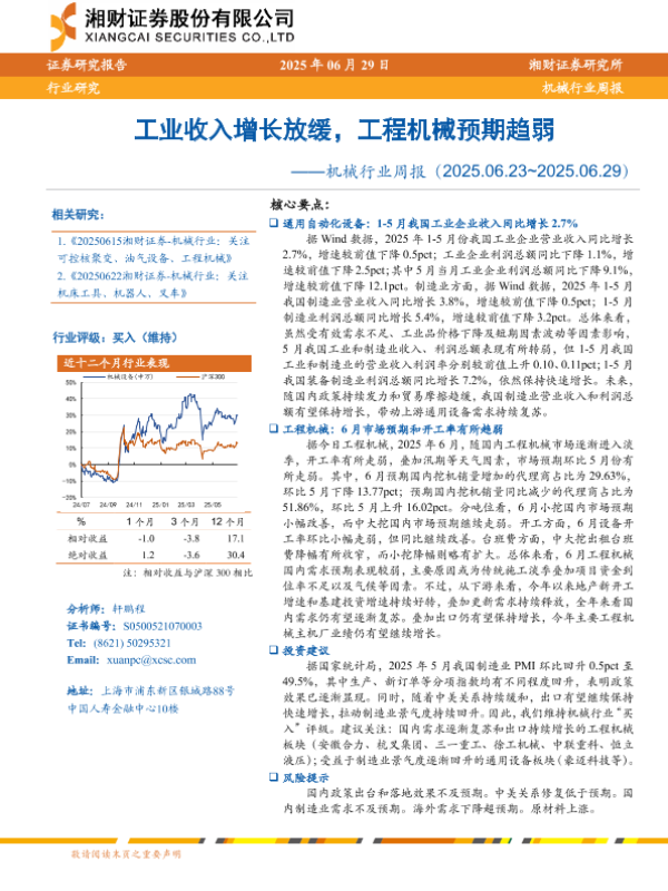 【湘财证券】【20250629】机械行业周报:工业收入增长放缓,工程机械预期趋弱-15页 行业研究