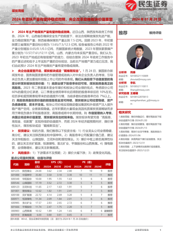 【民生证券】【20240128】2024年晋陕产量有望持稳或微降,央企改革助推板块价值重塑-27页 行业研究