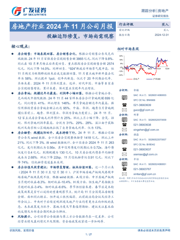 【广发证券】【20241231】房地产行业2024年11月公司月报:投融边际修复,市场尚需观察-27页 行业研究