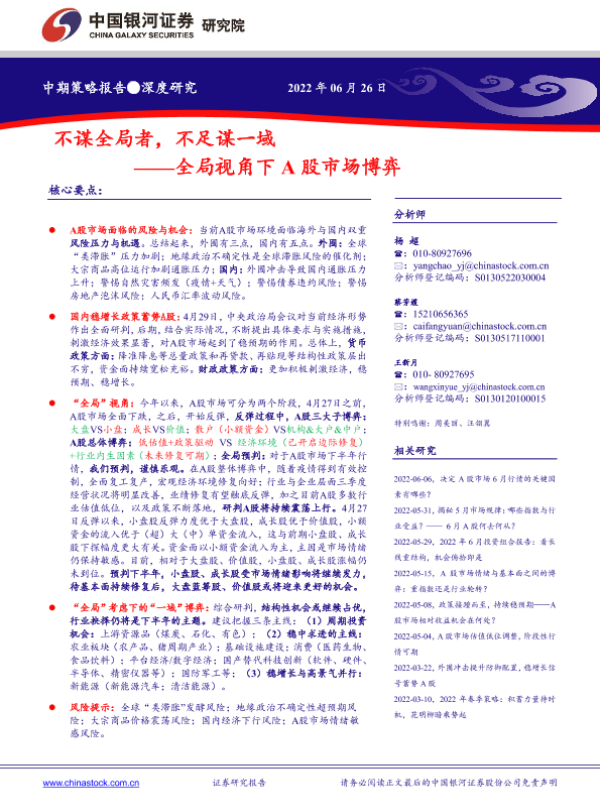 【银河证券】【20220626】全局视角下A股市场博弈:不谋全局者,不足谋一域-66页 行业研究