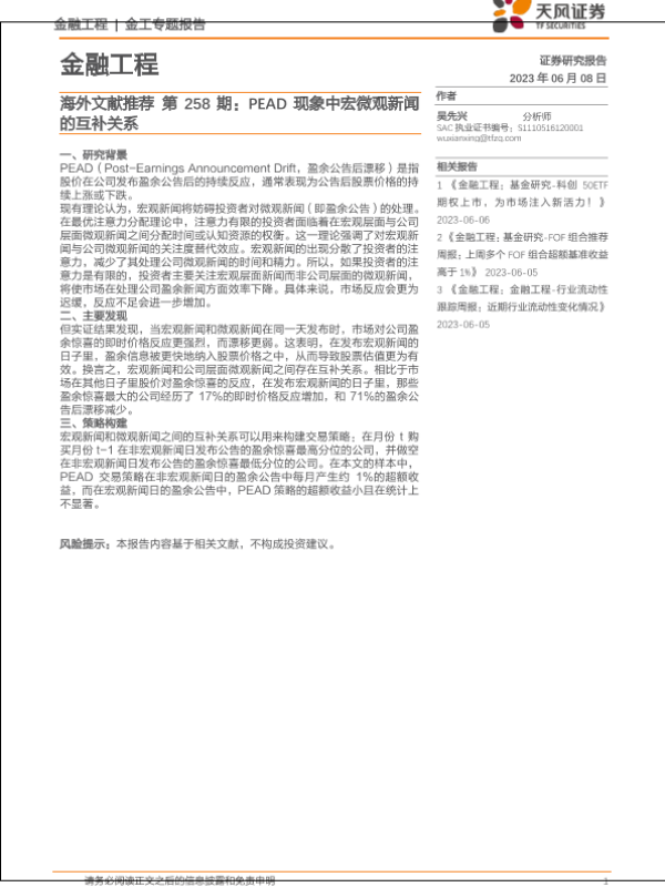 【天风证券】【20230608】PEAD现象中宏微观新闻的互补关系-20页 行业研究