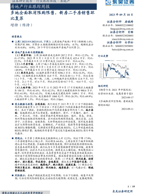 【东吴证券】【20230918】多地全面取消限购限售,新房二手房销售环比复苏-19页 行业研究