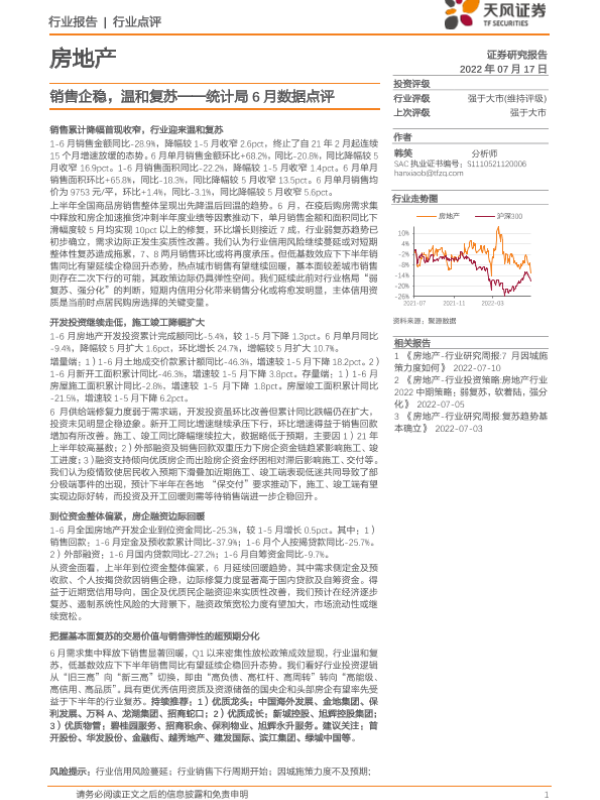 【天风证券】【20220717】统计局6月数据点评:销售企稳,温和复苏-8页 行业研究