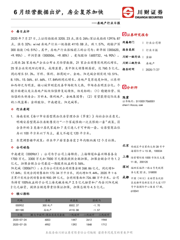 【川财证券】【20200727】6月经营数据出炉,房企复苏加快-3页 证券期货研究报告