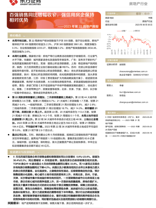 【东方证券】【20230605】2023年第22周地产周报:百强销售同比增幅收窄,强信用房企保持相对优势-15页 行业研究