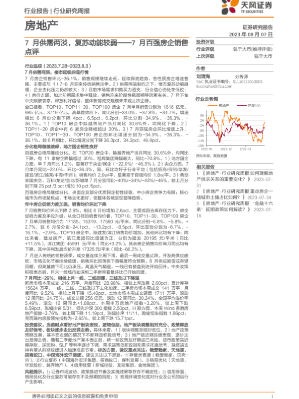 【天风证券】【20230807】7月百强房企销售点评:7月供需两淡,复苏动能较弱-17页 行业研究