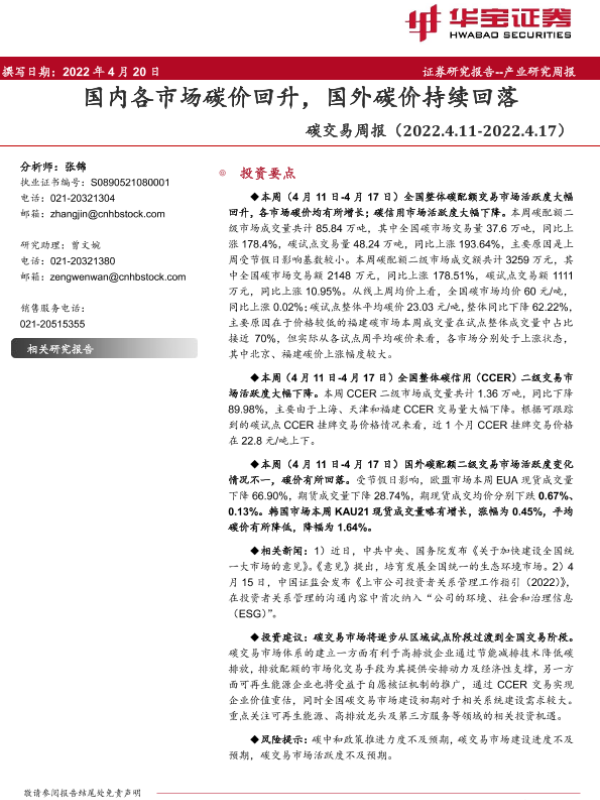 【华宝证券】【20220420】环保:碳交易周报:国内各市场碳价回升,国外碳价持续回落-13页 行业研究