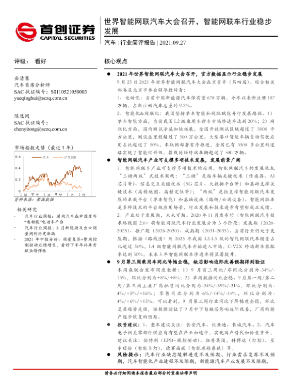 【首创证券】【20210927】20210927-首创证券-汽车行业简评报告:世界智能网联汽车大会召开,智能网联车行业稳步发展-11页 行业研究