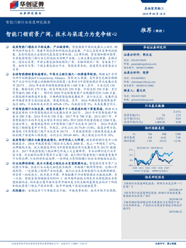【华创证券】【20190918】智能门锁前景广阔,技术与渠道力为竞争核心-14页 行业研究