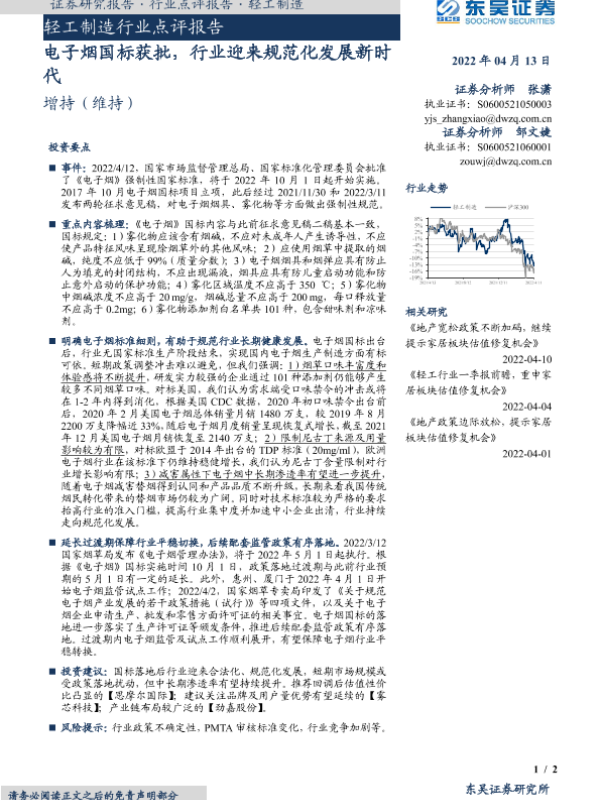 【东吴证券】【20220413】轻工制造行业点评报告:电子烟国标获批,行业迎来规范化发展新时代-2页 行业研究