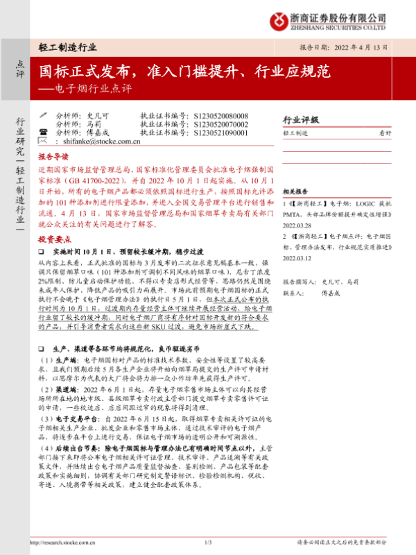 【浙商证券】【20220413】20220413-浙商证券-电子烟行业点评:国标正式发布,准入门槛提升、行业应规范-3页 行业研究