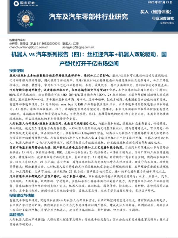 【国金证券】【20230729】机器人vs汽车系列报告(四):丝杠迎汽车+机器人双轮驱动,国产替代打开千亿市场空间-21页 行业研究