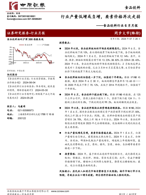 【中原证券】【20240726】食品饮料行业6月月报:行业产量低增或负增,要素价格再次走弱-12页 行业研究