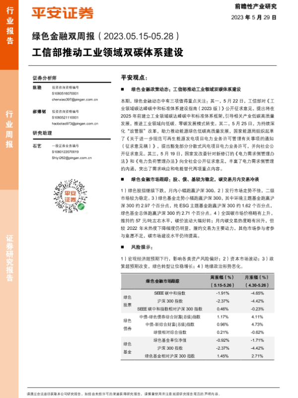 【平安证券】【20230529】绿色金融双周报:工信部推动工业领域双碳体系建设-10页 行业研究