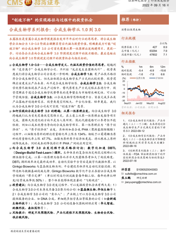 【海通证券】【20220916】医药生物行业合成生物学系列报告:合成生物学从1.0到3.0,“创造万物”的实现路径与过程中的投资机会-19页 行业研究