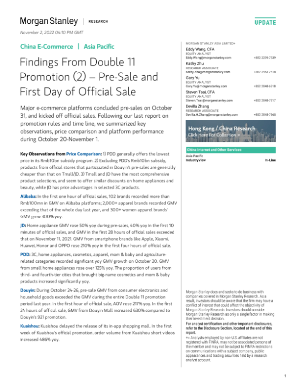 【Morgan Stanley】【20221102】中国电子商务双十一促销发现(2) - 预售和正式销售首日-18页 行业研究