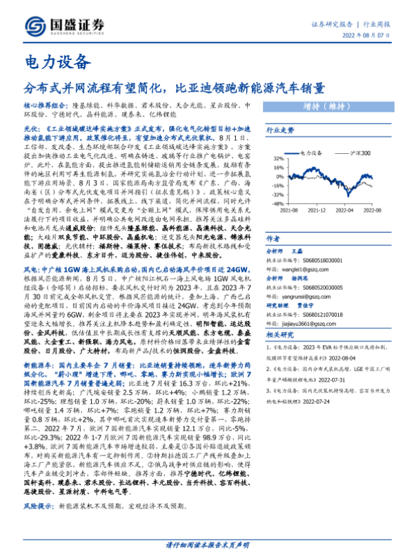 【国盛证券】【20220807】电力设备行业周报:分布式并网流程有望简化,比亚迪领跑新能源汽车销量-18页 行业研究