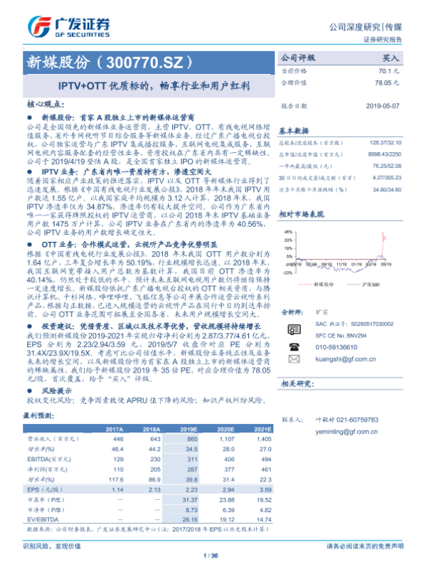 【广发证券】【20190507】新媒股份-300770.SZ-IPTV+OTT优质标的,畅享行业和用户红利-36页 行业研究