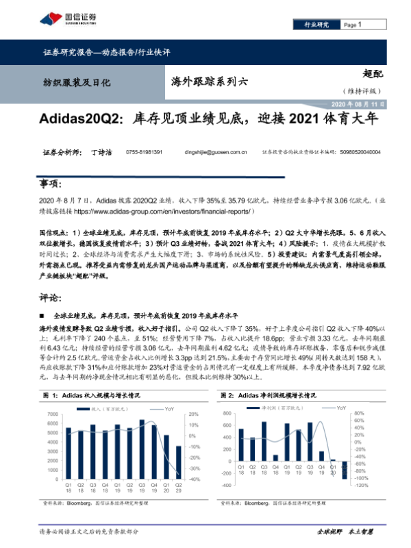 【国信证券】【20200811】纺织服装及日化海外跟踪系列六:Adidas20Q2:库存见顶业绩见底,迎接2021体育大年-8页 行业研究