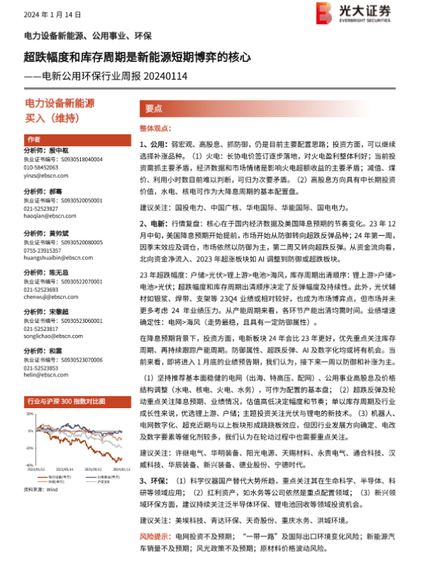 【光大证券】【20240114】电新公用环保行业周报:超跌幅度和库存周期是新能源短期博弈的核心-26页 行业研究