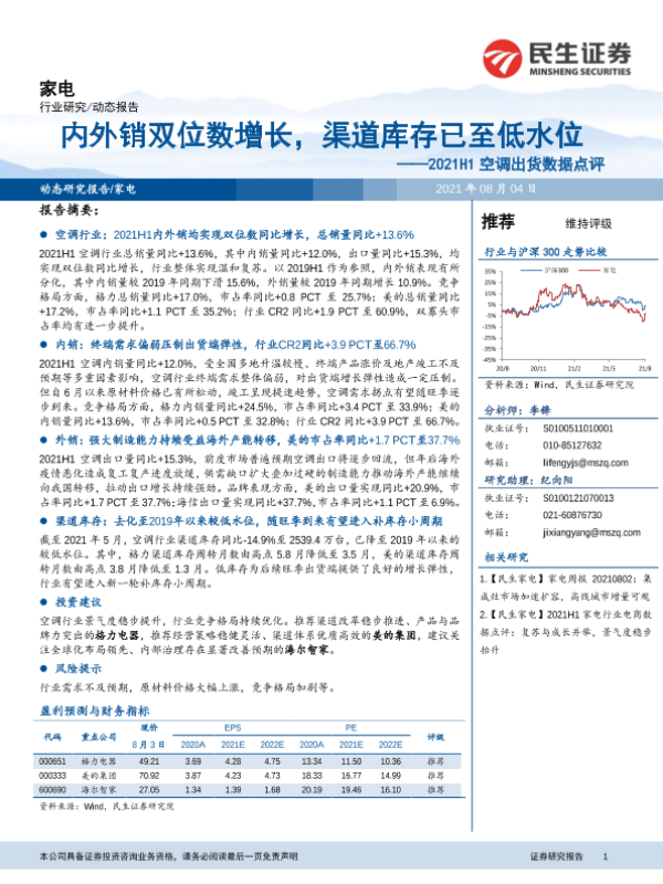 【民生证券】【20210804】家电行业2021H1空调出货数据点评:内外销双位数增长,渠道库存已至低水位-11页 行业研究