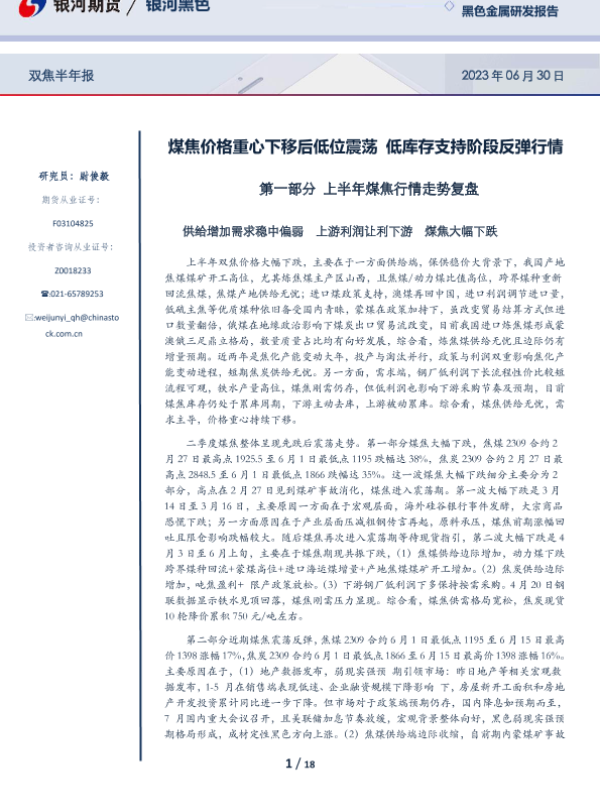 【银河期货】【20230630】双焦半年报:煤焦价格重心下移后低位震荡,低库存支持阶段反弹行情-18页 行业研究