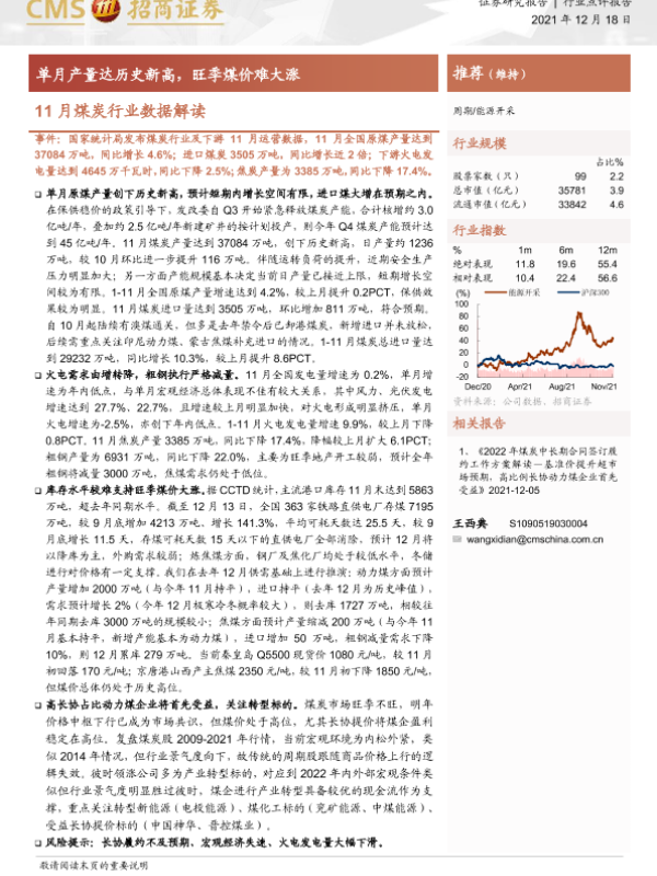 【海通证券】【20211218】11月煤炭行业数据解读:单月产量达历史新高,旺季煤价难大涨-4页 证券期货研究报告