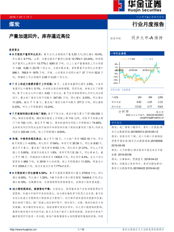 【华金证券】【20190717】20190717-华金证券-煤炭行业月度报告:产量加速回升,库存逼近高位-16页 行业研究