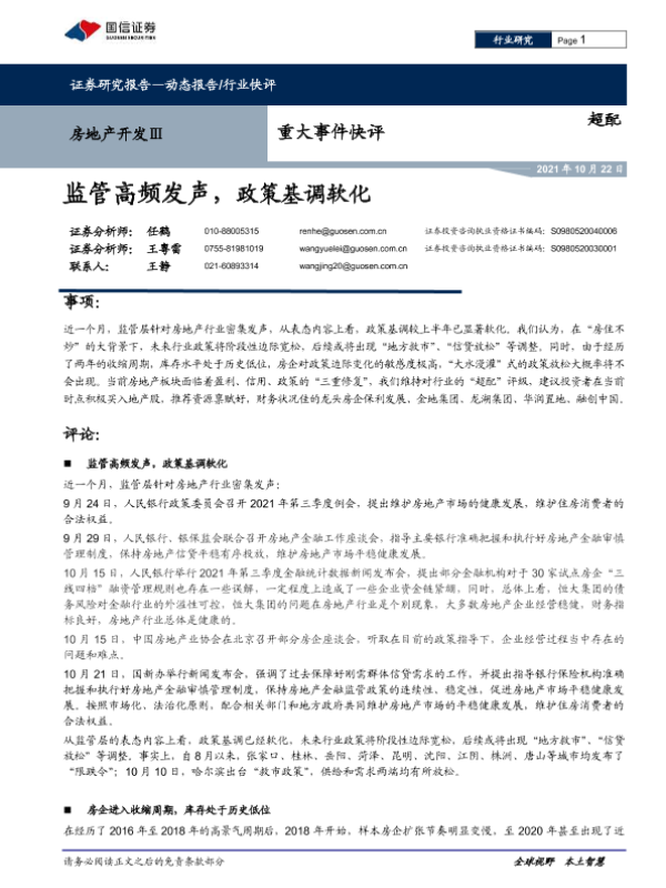 【国信证券】【20211022】房地产开发Ⅲ重大事件快评:监管高频发声,政策基调软化-4页 行业研究