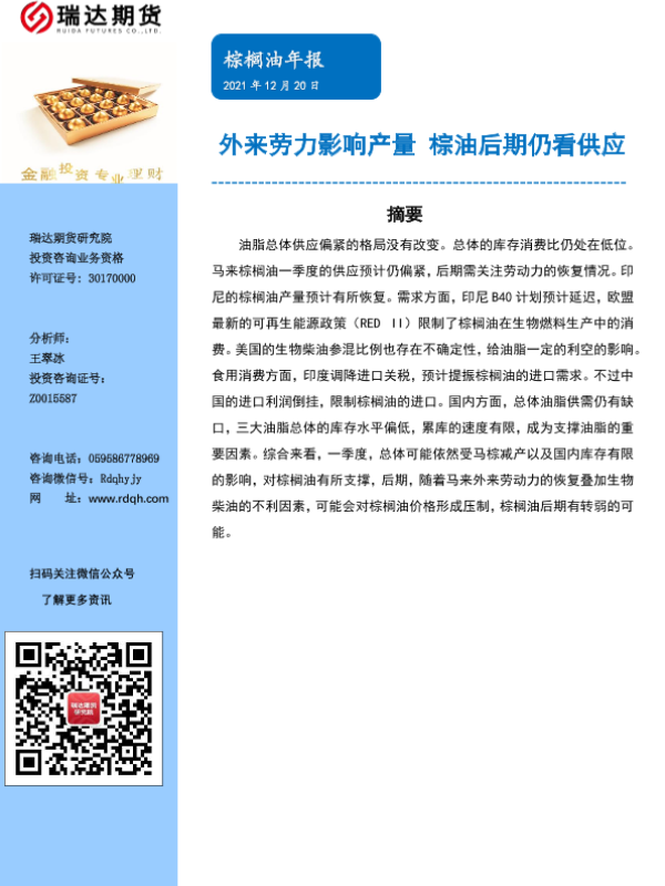 【瑞达期货】【20211220】棕榈油年报:外来劳力影响产量,棕油后期仍看供应-16页 行业研究
