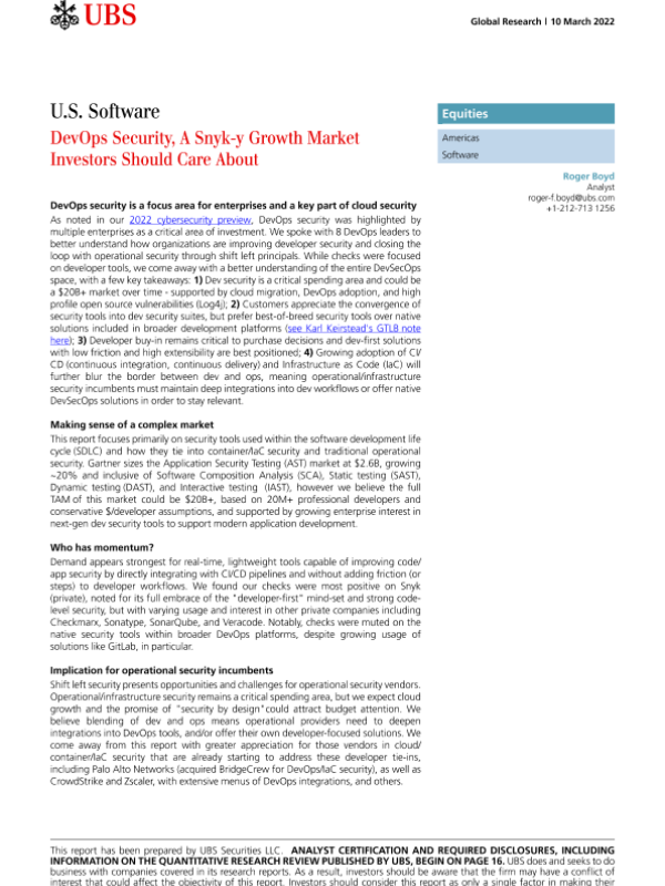 【瑞银】【20220310】瑞银-美股软件行业-DevOps Security,一个值得投资者关注的增长市场-24页 行业研究