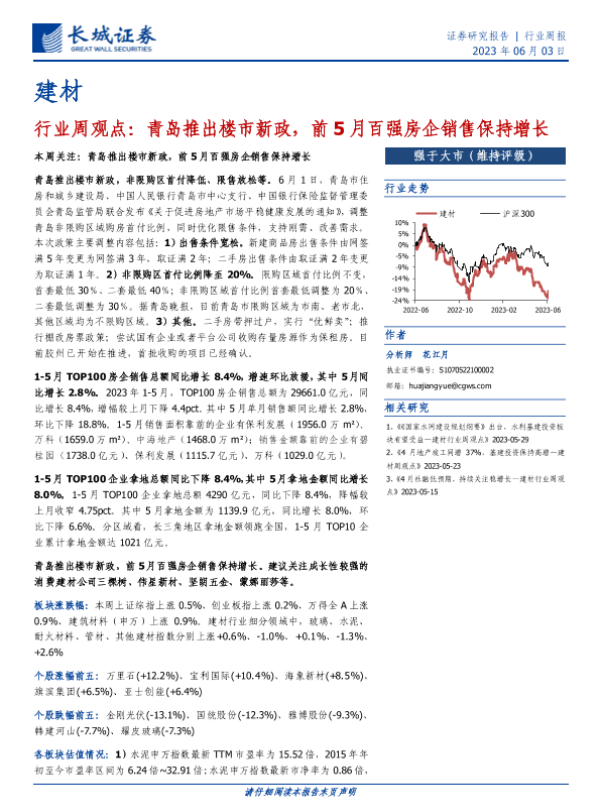 【长城证券】【20230603】建材行业周观点:青岛推出楼市新政,前5月百强房企销售保持增长-18页 行业研究