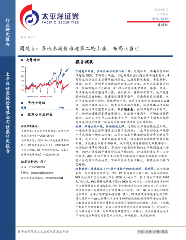 【太平洋证券】【20200510】建材Ⅲ周观点:多地水泥价格迎第二轮上涨,布局正当时-19页 行业研究
