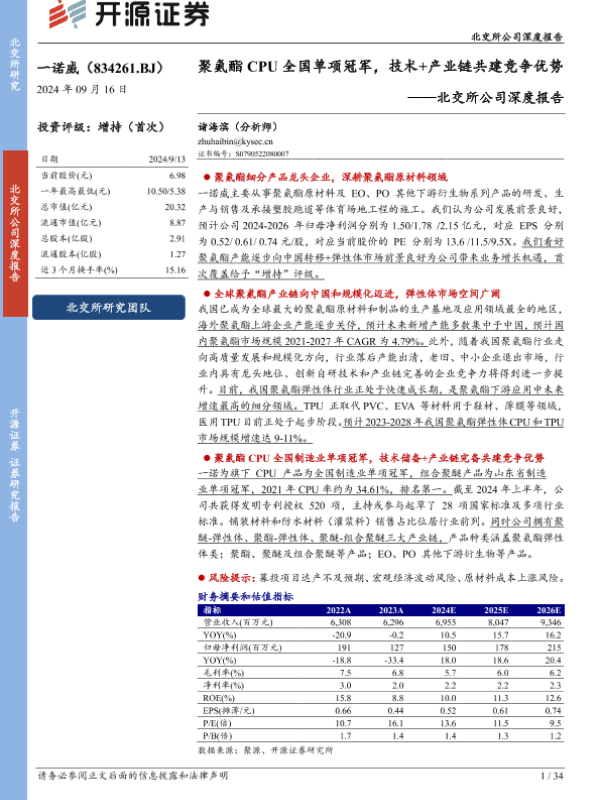 【开源证券】【20240916】一诺威(834261)北交所公司深度报告:聚氨酯CPU全国单项冠军,技术+产业链共建竞争优势-34页 行业研究