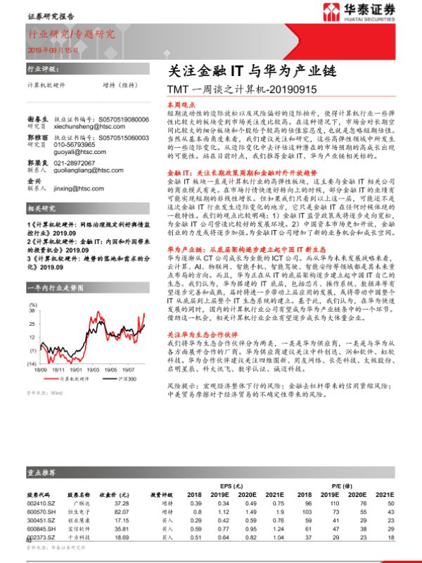 【华泰证券】【20190915】TMT一周谈之计算机:关注金融IT与华为产业链-8页 行业研究