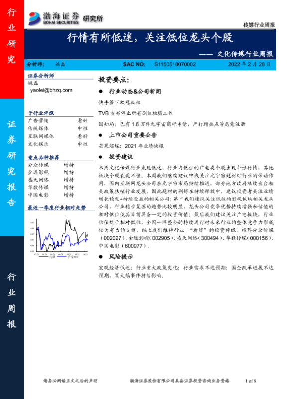 【渤海证券】【20220228】文化传媒行业周报:行情有所低迷,关注低位龙头个股-8页 行业研究