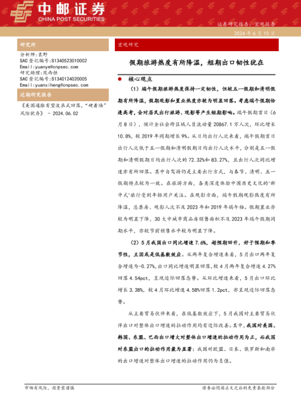 【中邮证券】【20240610】假期旅游热度有所降温,短期出口韧性犹在-37页 行业研究