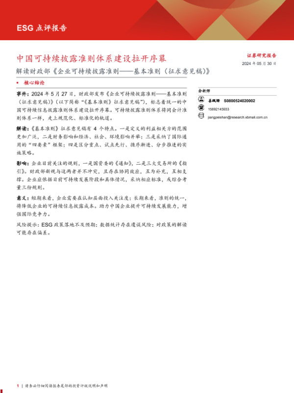 【西部证券】【20240530】ESG点评报告:解读财政部《企业可持续披露准则——基本准则(征求意见稿)》,中国可持续披露准则体系建设拉开序幕-10页 行业研究