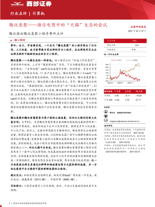 【西部证券】【20210307】腾讯推出腾讯惠聚小程序事件点评:腾讯惠聚——微信电商中的“天猫” 生态的尝试-2页 行业研究