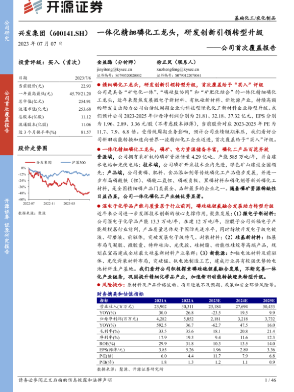 【开源证券】【20230707】兴发集团(600141)公司首次覆盖报告:一体化精细磷化工龙头,研发创新引领转型升级-46页 行业研究