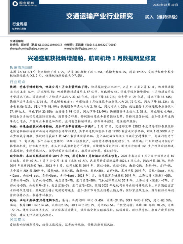 【国金证券】【20230219】交通运输行业周报:兴通盛航获批新增船舶,航司机场1月数据明显修复-14页 行业研究