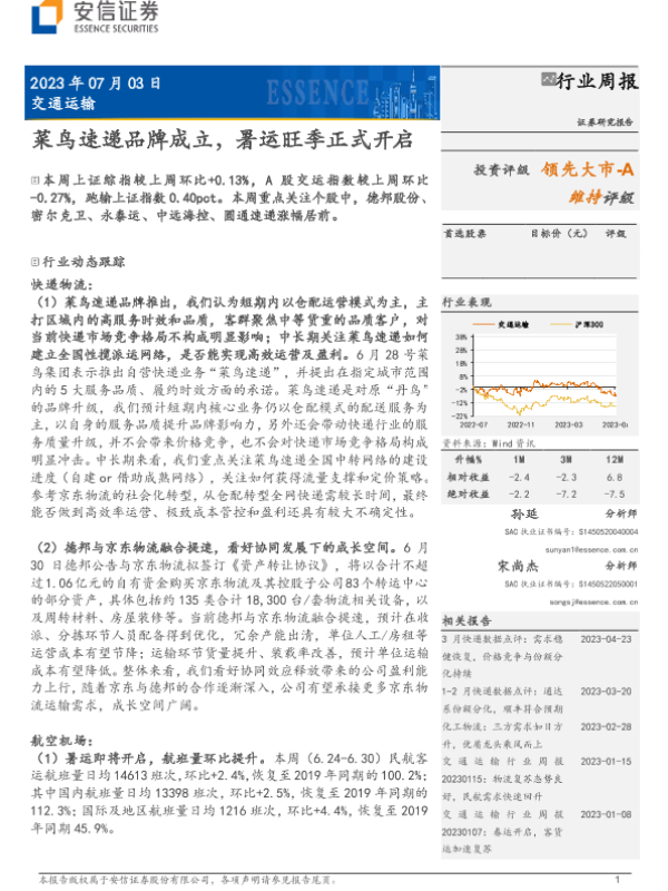【安信证券】【20230703】交通运输行业周报:菜鸟速递品牌成立,暑运旺季正式开启-22页 行业研究
