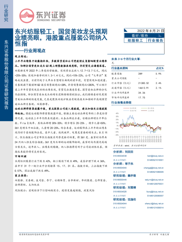 【东兴证券】【20220821】东兴纺服轻工:国货美妆龙头预期业绩亮眼,港股重点服装公司纳入恒指-14页 行业研究
