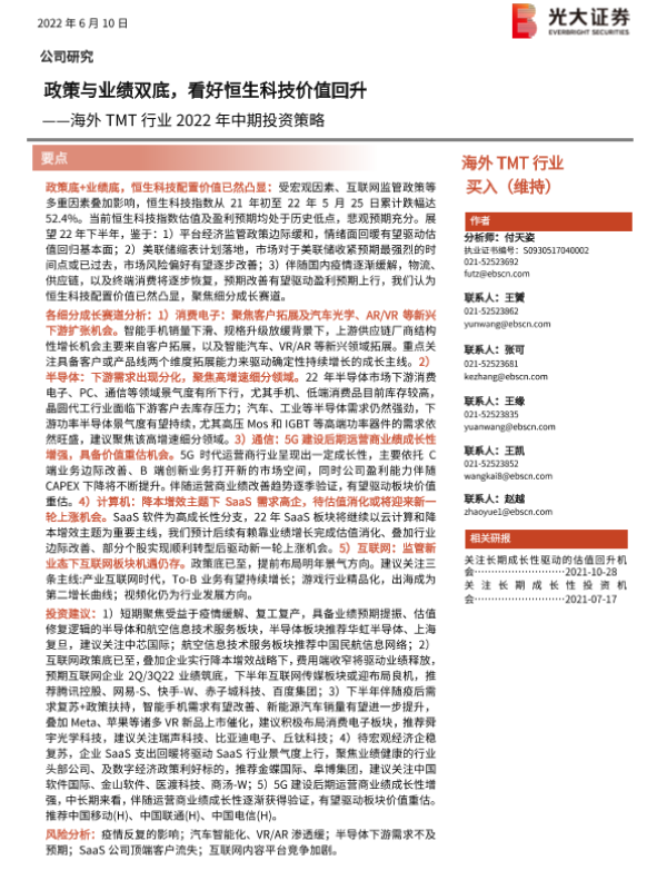 【光大证券】【20220610】海外TMT行业2022年中期投资策略:政策与业绩双底,看好恒生科技价值回升-72页 行业研究