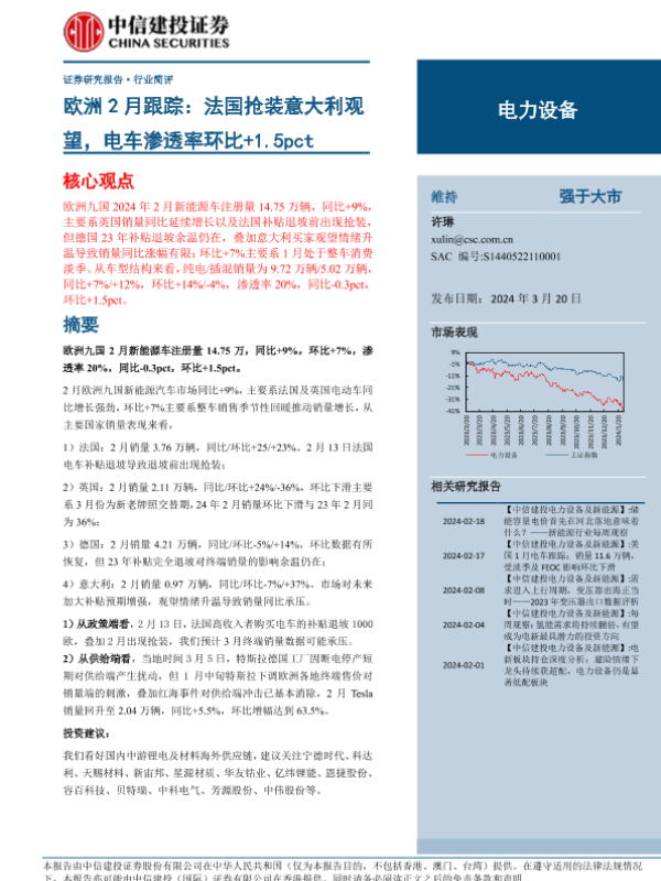 【中信建投证券】【20240320】电力设备行业欧洲2月跟踪:法国抢装意大利观望,电车渗透率环比+1.5pct-20页 行业研究