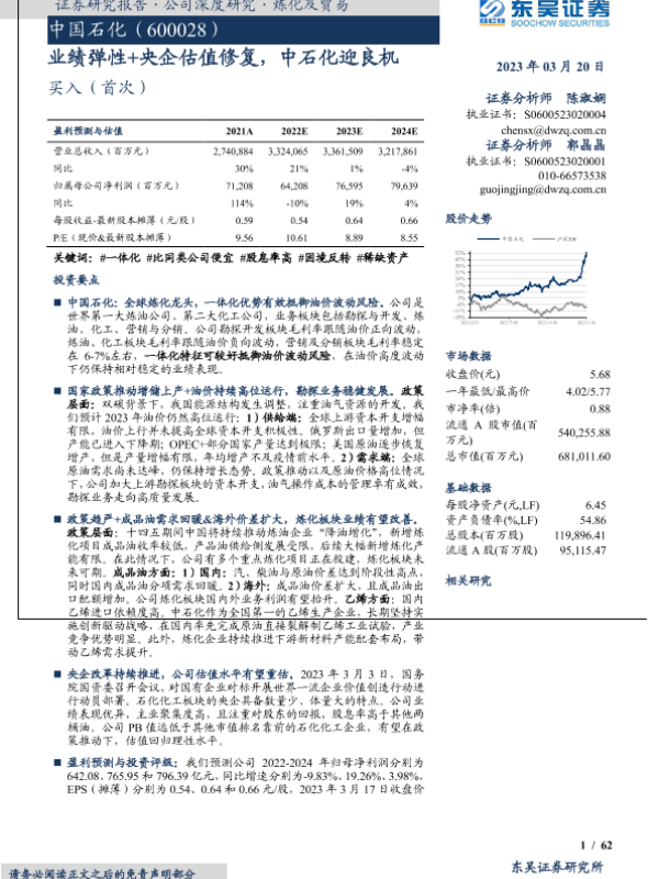 【东吴证券】【20230320】业绩弹性+央企估值修复,中石化迎良机-62页 行业研究