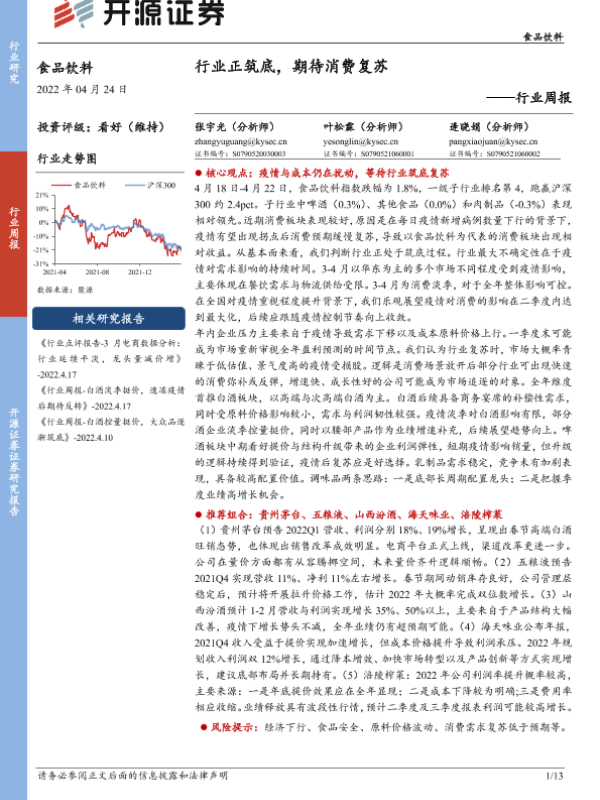 【开源证券】【20220424】食品饮料行业周报:行业正筑底,期待消费复苏-13页 行业研究
