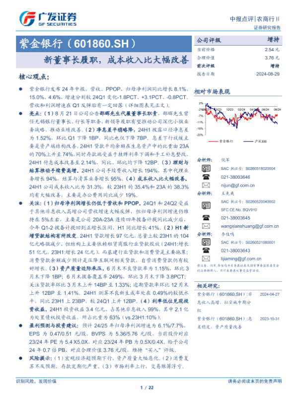 【广发证券】【20240829】紫金银行(601860)新董事长履职,成本收入比大幅改善-22页 行业研究